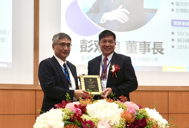 友達董事長彭双浪獲頒「工業工程獎章-產業貢獻獎」,由中國工業工程學會理事長楊能舒 (左) 頒獎